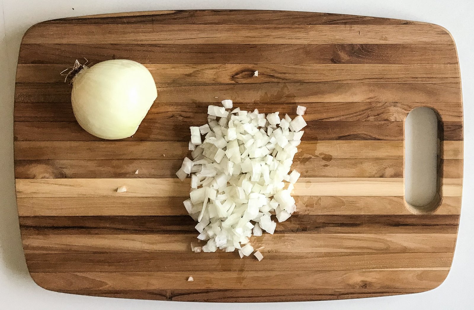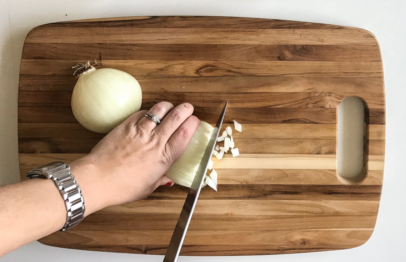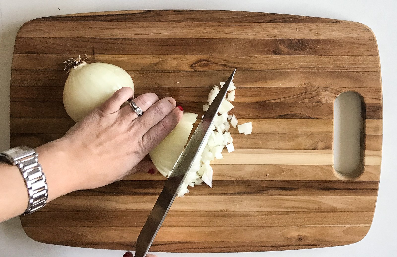 On a clean cutting board, let’s start the dicing. Holding your knife in one hand and the root of the onion in the other hand follow these instructions!
