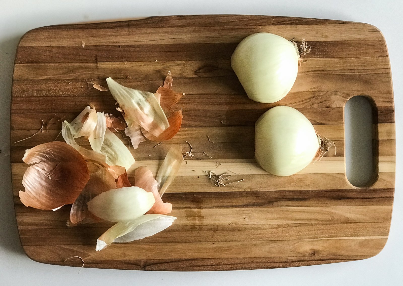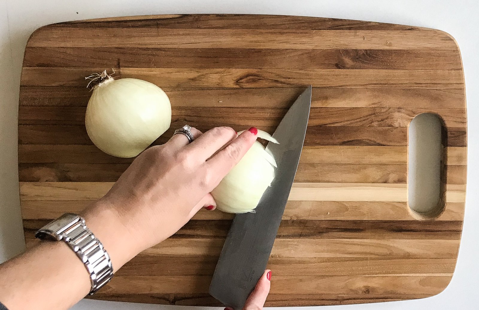 Peel the onion. On the opposite side of the root, I cut off the end and take off the peel, the thin top layer and the slimy film that is on the onion.