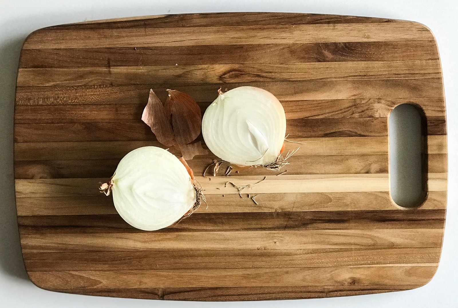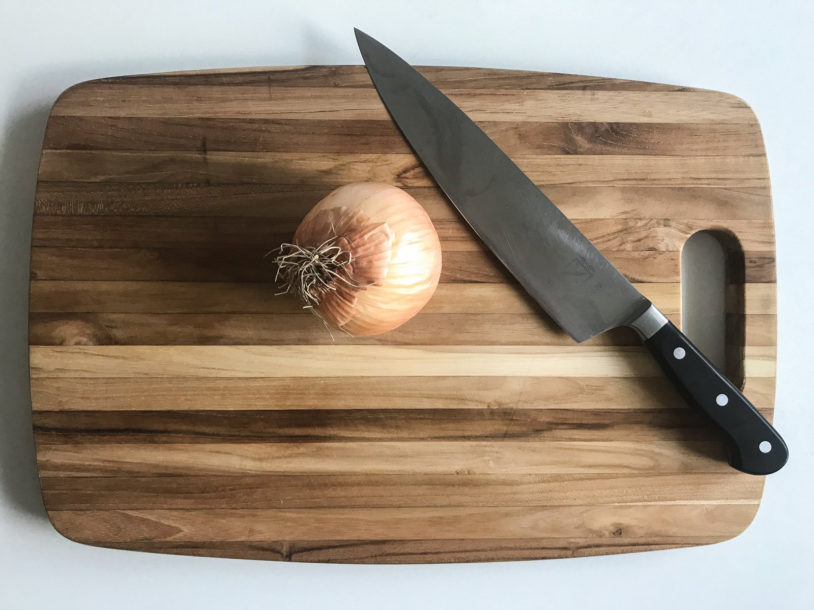 Get an onion and knife. Use a chef’s knife, not a small pairing knife like my mom does..also make sure your knife is sharp, there’s a saying that a dull knife is the most dangerous tool in a kitchen and it’s true. The more work you have to put into using your knife the higher the chance of slipping and cutting yourself.