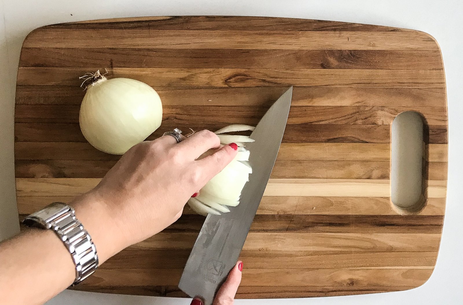 Once you’ve made vertical cuts down and across the onion as described above, you will continue to hold the onion by the root. You will want to turn your knife horizontally to make individual cuts in the opposite direction.
