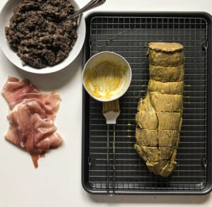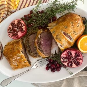 Itโs a large beef tenderloin, otherwise known as chateaubriand, which is the same as filet mignon but not cut into single steak servings. Topped with duxelles (onions, mushrooms, herbs), wrapped into prosciutto, then wrapped in buttery puff pastry and baked to perfection. It seems very over-the-top which it is, but that is what makes it so special for celebrating.ย