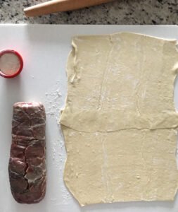 - Step five:ย Wrap the beef tenderloin in puff pastry. Overlapping the edges of two sheets of puff pastry dough, roll it out to about just under a 1/4 of an inch thick.