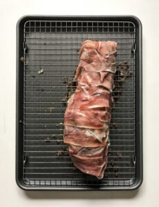 - Step three:ย Wrap the top in prosciutto layers. I layer mine one and tuck the ends of the prosciutto under the beef tenderloin.