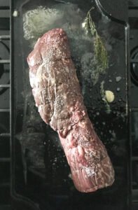- Prepping the Beef Tenderloin: Sprinkle with salt and set it aside to let the salt dissolve.If you want to shape to your beef tenderloin you can tie it with twine (or keep the twine on until it is seared if your beef tenderloin comes tied already)