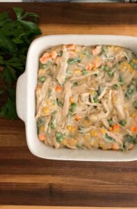 I’m not kidding when I say that you can have this chicken pot pie on your table in under 60 minutes without using canned condensed soup and only with a few staple ingredients.
