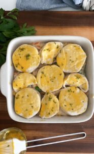 - Top your pot pie filling with canned biscuits. It's okay to tear in half if it makes them fit your casserole dish better. Brush on your egg wash.
