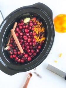 Save time and stove space by using your slow cooker. Once you add in all of your ingredients, you can set it on high for about 2 hours, stirring occasionally. Once the cranberries start to pop open and the spices have become fragrant you can turn the heat down to warm or off until dinnertime.