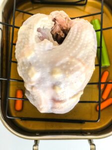- Place your turkey breast, breast-side up on your roasting rack. On the bottom of the roasting pan, pour in 2 cups of stock or water add 1 chopped celery and 1 chopped carrot.