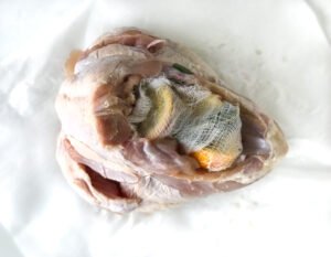 As you will notice, the bottom of the cavity hole is a lot larger compared to a full turkey because the backbone was trimmed so you are only stuffing behind the ribs with these ingredients. To keep them from falling out after you place the turkey breast-side up in the roasting rack, place a piece of cheesecloth over the spices, herbs and oranges and tuck it under the edges of the opened cavity.