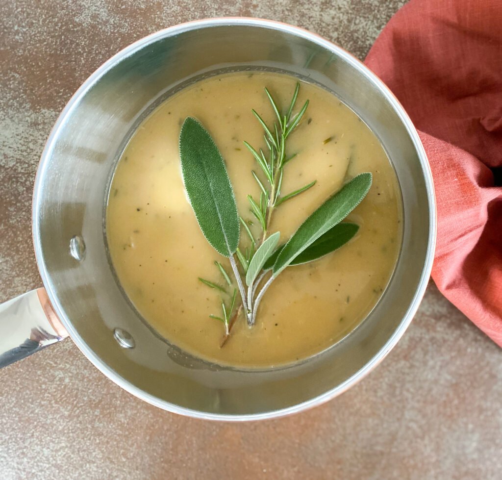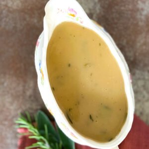Herbs – you’re choice, you can skip them. I like to tie up a bouquet of fresh herbs just to give it a little extra warm-cozy flavor, but it’s totally optional. You can do this and leave in the little pieces that break off (like my picture) or you can strain the gravy before serving.