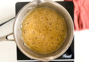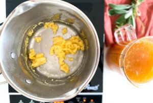 - In a pot over medium heat melt the butter. Add in your flour. Stir to mix until it looks like wet sand.