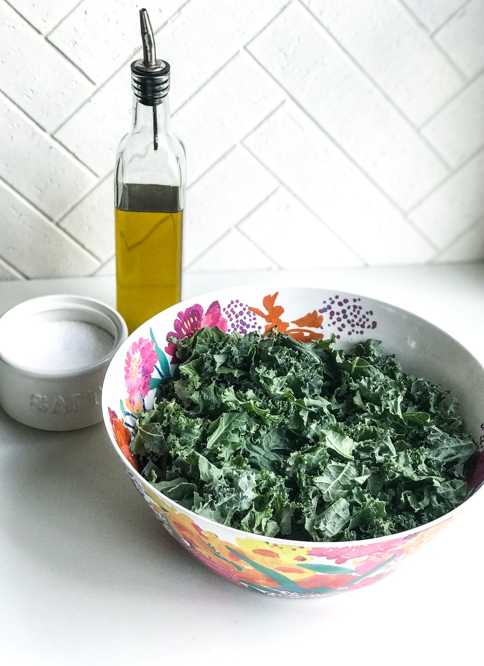 Put your kale in a bowl, sprinkle a pinch of salt (this is where a little goes a long way, you can add more to taste before you eat it) and drizzle with olive oil. Just a light coating of olive oil, similar to if you were drizzling light salad dressing over your salad.