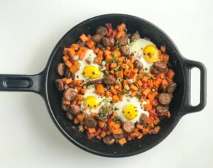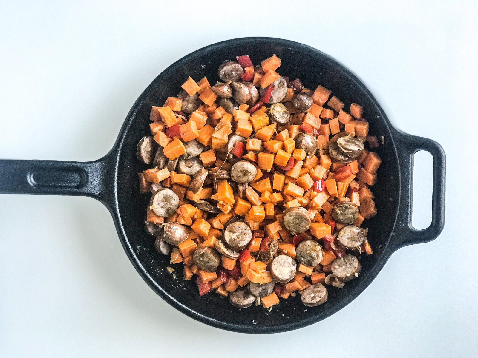 If you’re making the sweet potato hash crispier, I would recommend making your eggs in a different pan and adding them to the top of the hash when you serve it up.