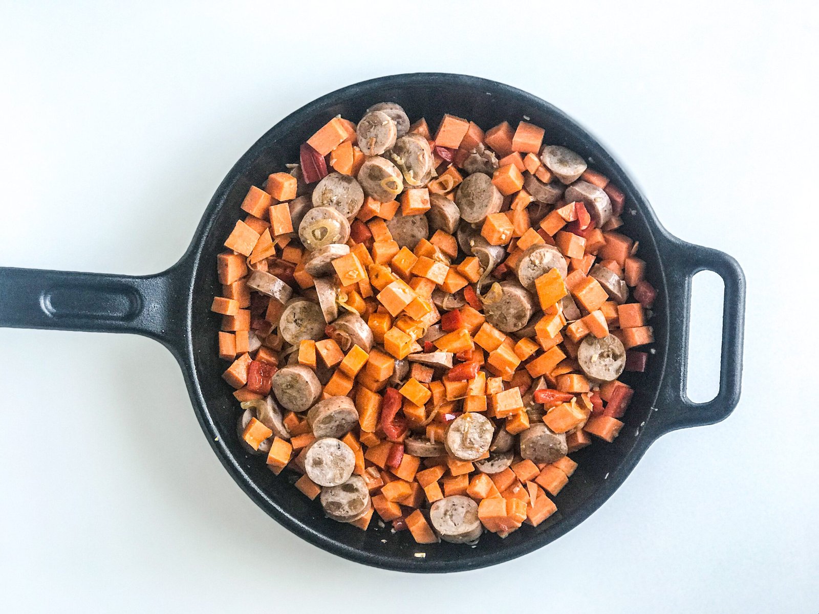 - Add in your sweet potatoes, red pepper, and chicken sausage. Stir until everything is evenly distributed throughout the pan. Cook together over medium heat until the potatoes start to become tender, they shouldn't be soft but should be easy to stick a fork in without it falling off, about 3-5 minutes.