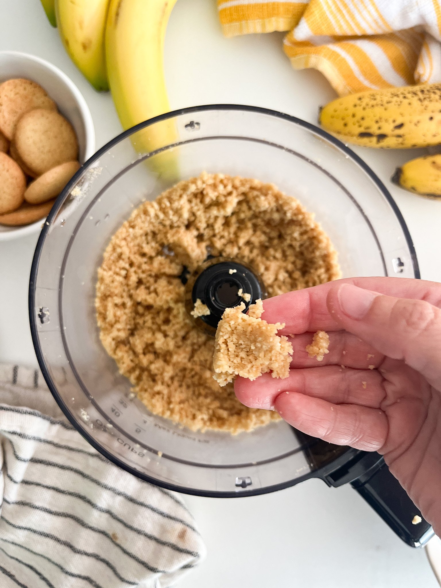 - Pulse until the wafers are small crumbs and the butter is fully incorporated. When you press it between your fingers, it should stick together.