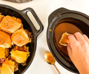 - Dip the bottom of the top of your roll into the reserved BBQ sauce and top your sandwich.