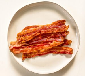 The easiest way to make bacon is in the oven. It’s grease splash proof and super simple. Preheat the oven to 450F. Line a cookie sheet with edges with foil or parchment paper, then lay down your bacon slices side by side. Bake for about 10-15 minutes until your preferred crispiness, drain and cool on a paper towel.