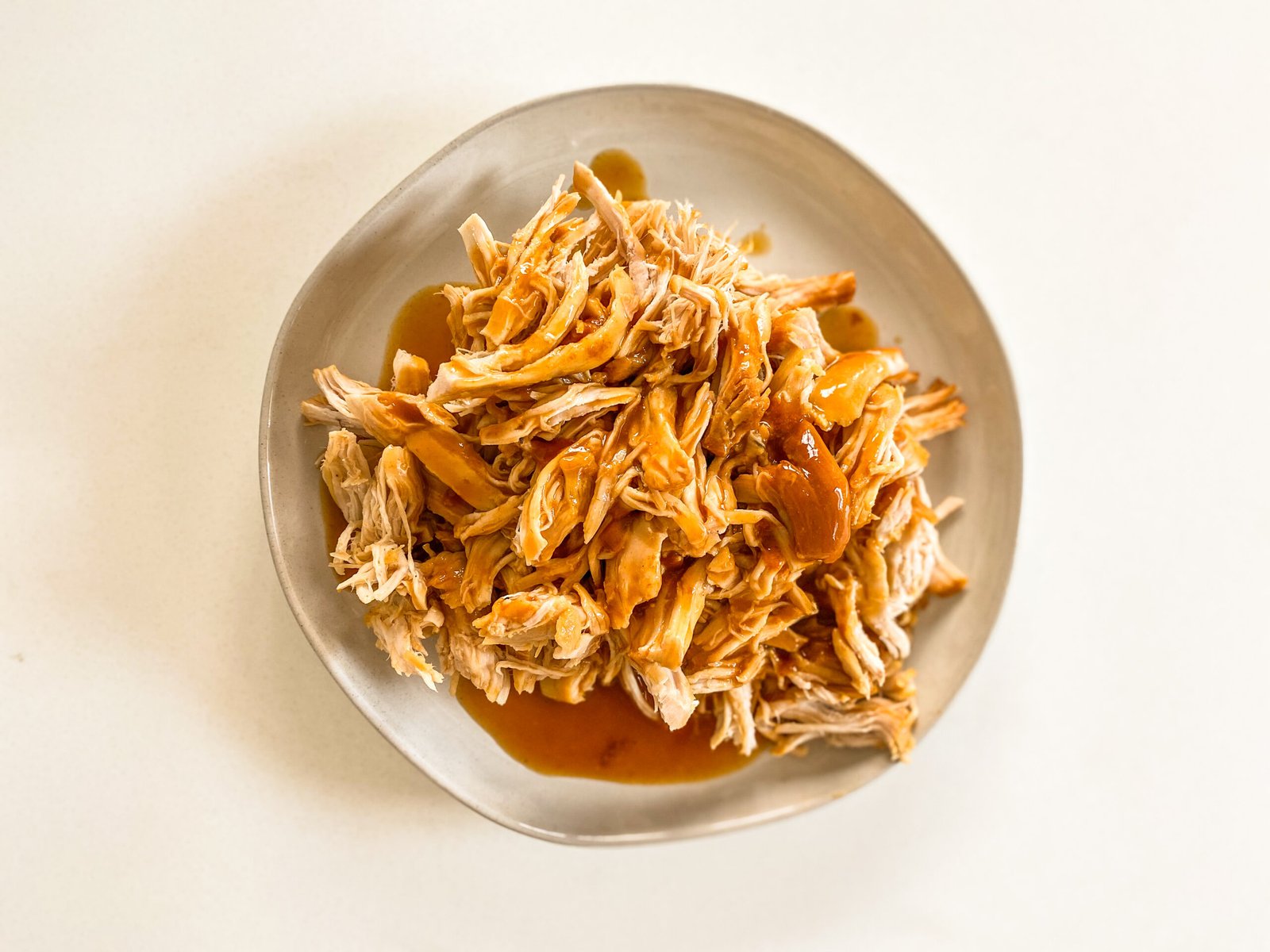 - Shred the chicken, pour some of the BBQ sauce over the chicken and reserve the rest of the BBQ sauce.