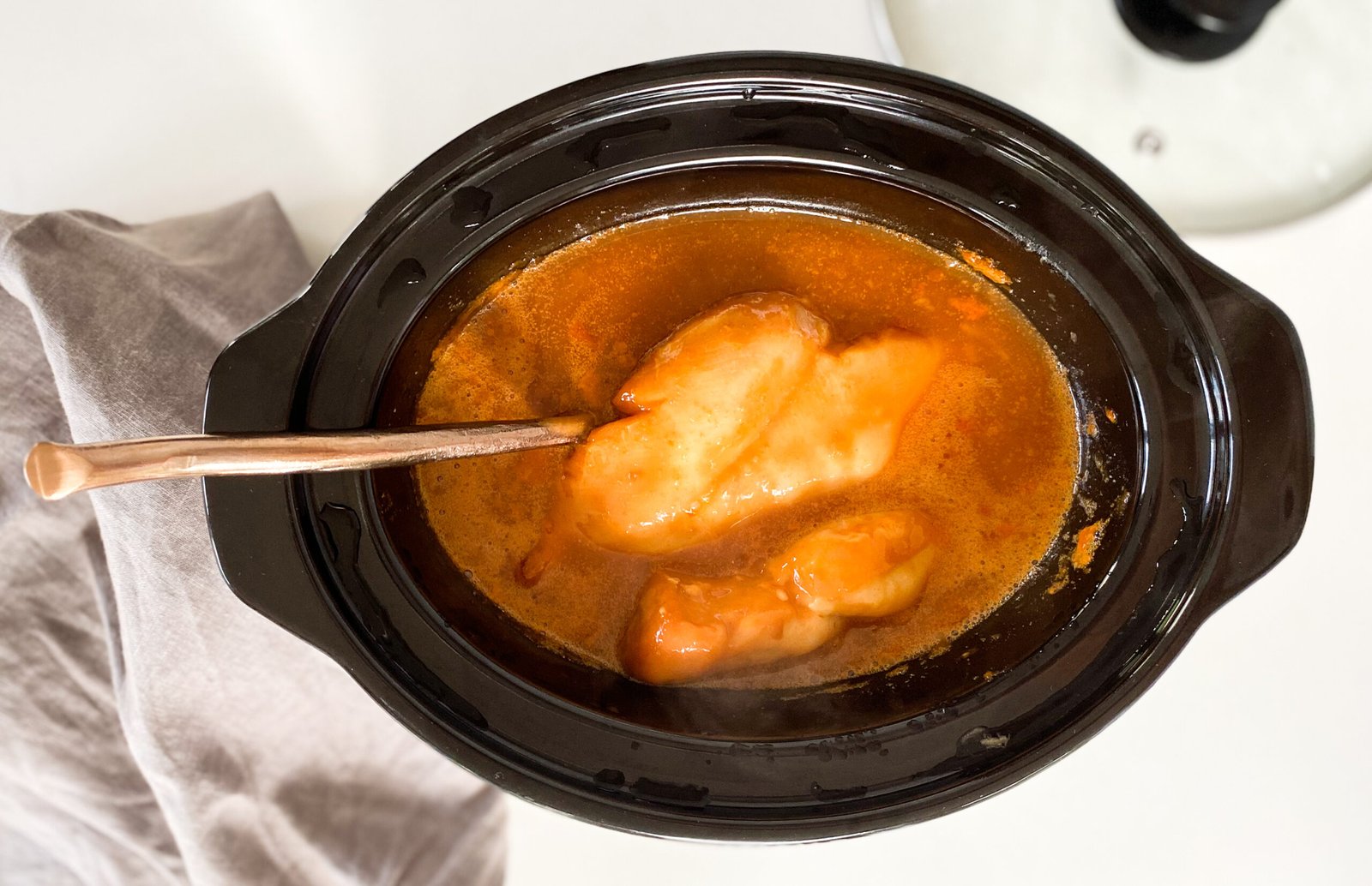 - In a crockpot, add in your chicken breasts and cover with your gold BBQ sauce. Cook on high for 3-4 hours or low for 6-7 hours. Cook until the chicken is 165F and can easily be shredded. As the chicken cooks, you will want to work on the toppings, this can be done at anytime.