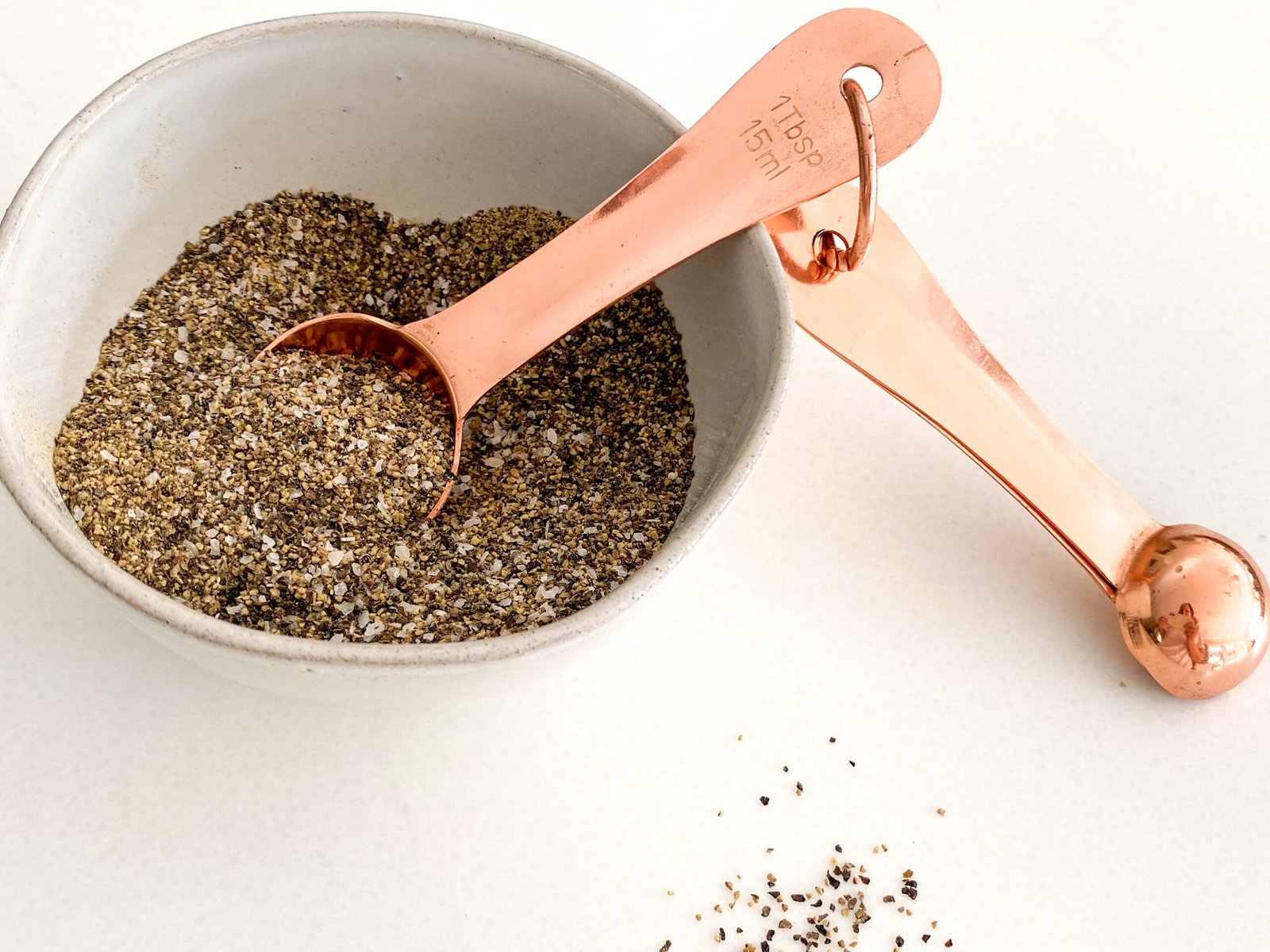- Combine the coarse ground and regular ground peppers with the kosher salt.¼ cup Coarse Ground Black Pepper, 2 TBSP Ground Black Pepper, 1 TBSP Kosher Salt