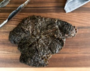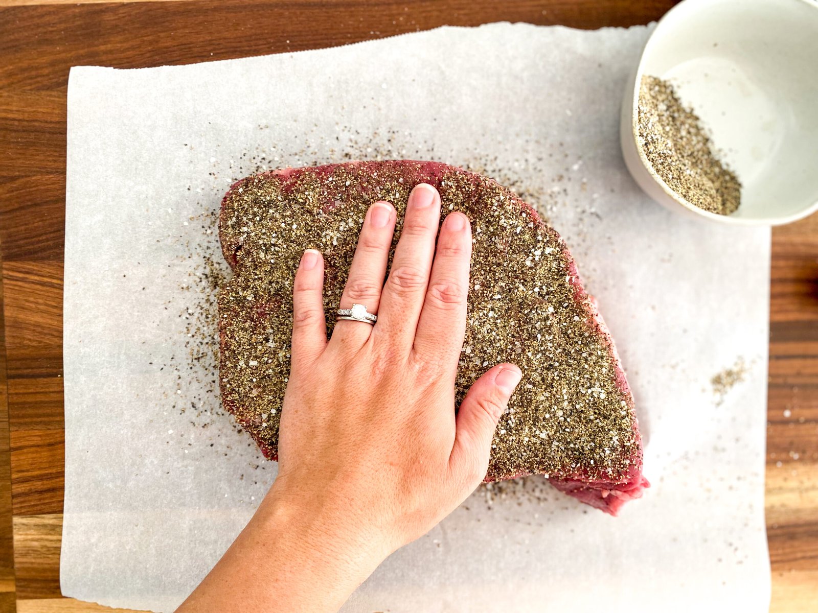 For this you want to mix coarse-ground and regular ground black pepper with some kosher salt to round out the flavors. The ground pepper will fall into the crevasses created by the coarse pepper pieces and kosher salt so that the entire pot roast is smothered in dry black pepper. Press down to lock it into place.