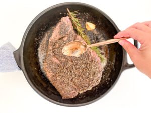 It’s an extra step but totally worth it. Over hot heat with butter, garlic and herbs, sear your pot roast on one side about about 2 minutes, flip and do the same with the other side. To create black pepper crust, carefully spoon the butter over the pot roast until browned.