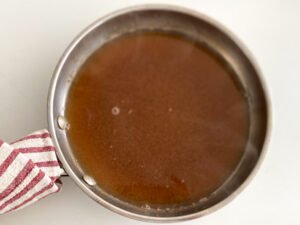 - Flambé ¼ cup of the apple cider and ¼ cup of bourbon. Off the stove, In a stainless steel pan with high-sides, add the apple cider and bourbon. Place the pan over medium-high heat and allow the liquid to warm up and start to evaporate. Place your long lighter over the evaporation, not submerged in the liquid, and light. A flame will spark quickly. Let the flame burn until it burns off on its own, the apple cider and bourbon will be thicker and more concentrated. Have a lid to the pan nearby if you get uncomfortable, place the lid over the flame at any time to smother the fire out. If this is your first time read about tips and safety in the blog post.