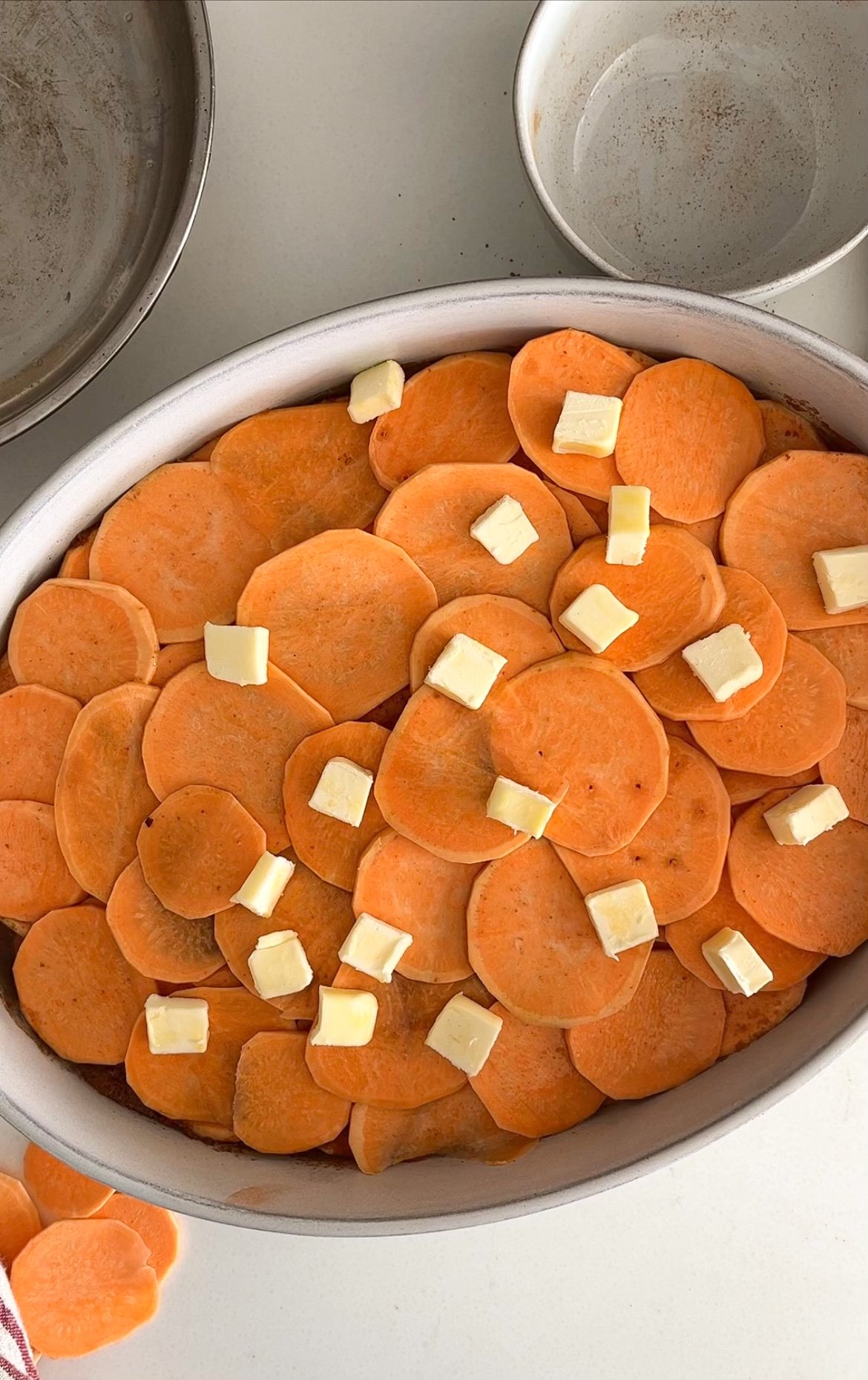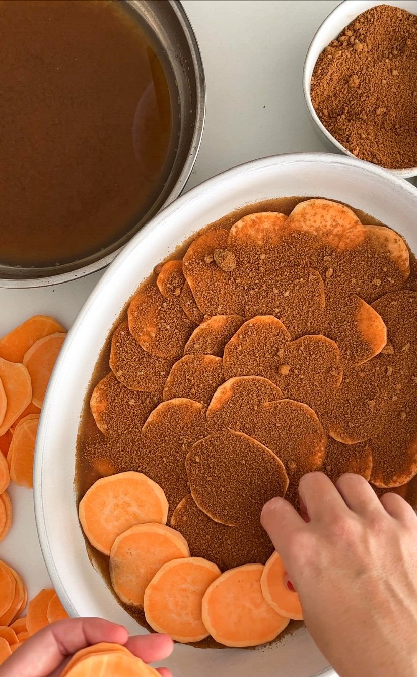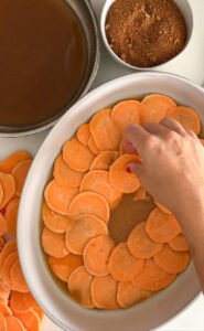 - Once the first layer of sweet potatoes are placed, sprinkle on brown sugar cinnamon mixture to cover and start another layer of sweet potatoes. Repeat until you have 5 total layers of sweet potatoes. The top layer should end with sweet potatoes.