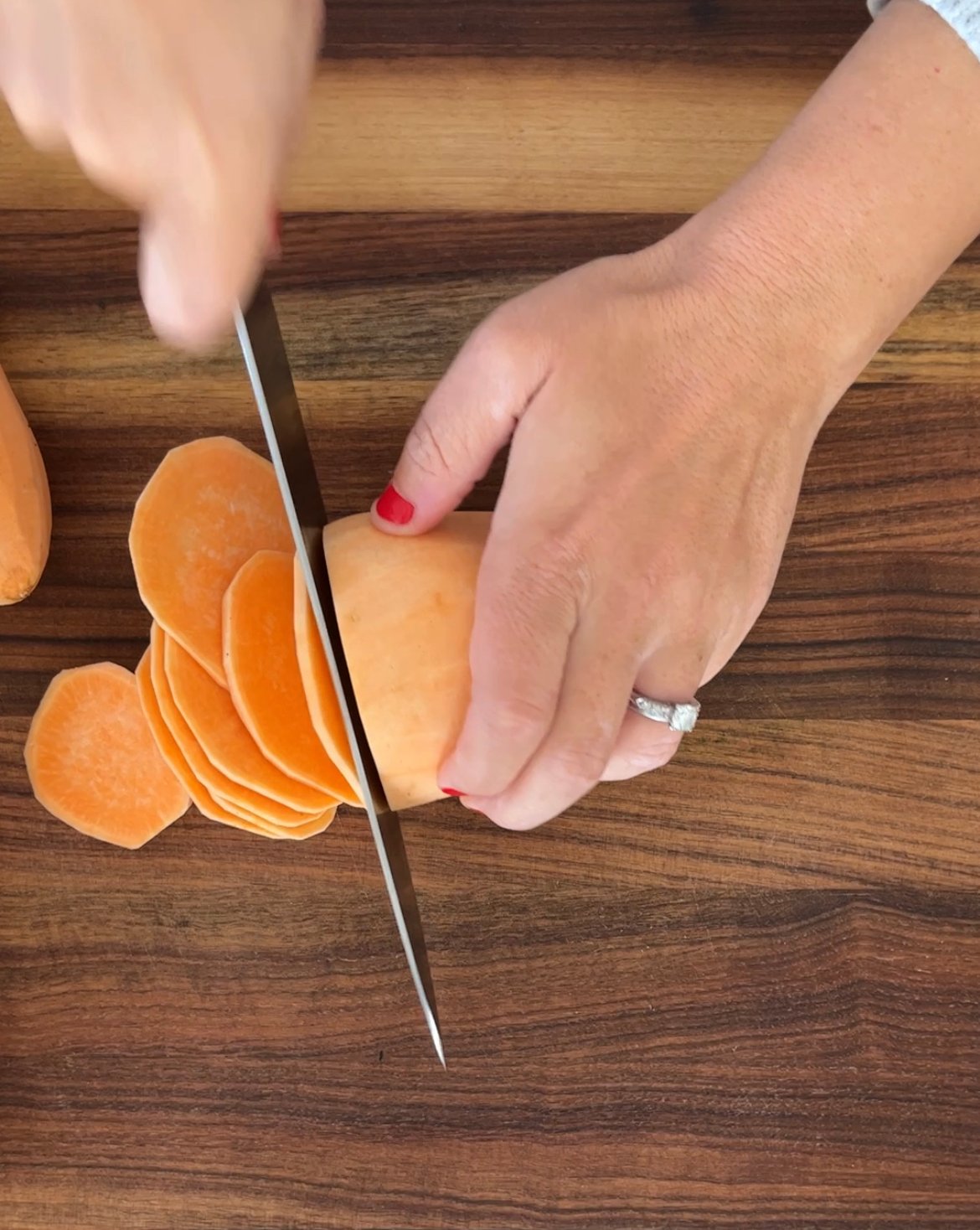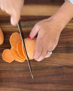 - Peel and cut the sweet potatoes so they are ? inch thick.