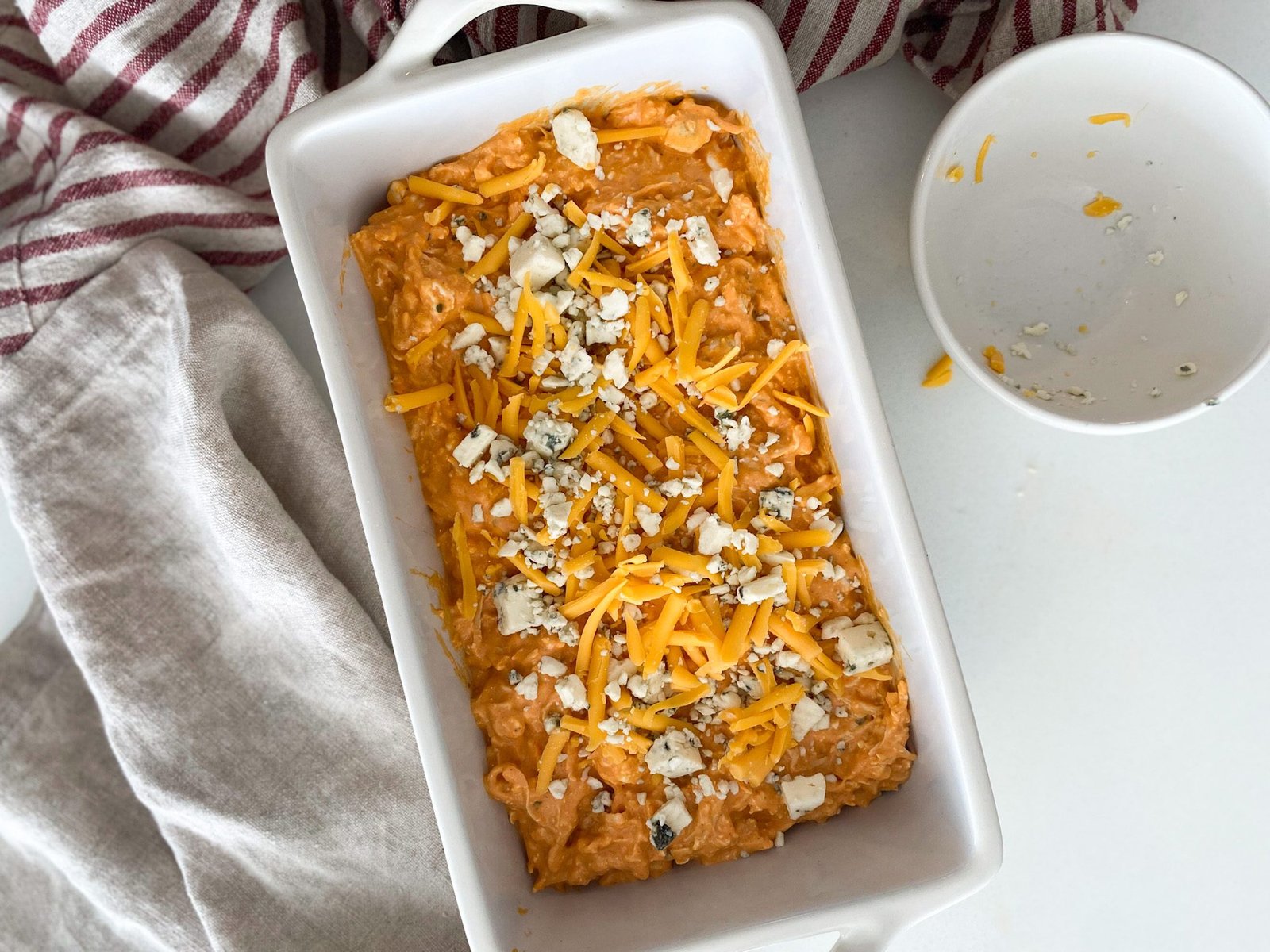 - Using a stand mixer and paddle attachement or a spoon - in a bowl mix together the cream cheese, shredded chicken, blue cheese crumbles, shredded cheddar cheese, ranch dressing and buffalo sauce.8 oz Softened Cream Cheese, 3 cup Shredded Chicken, 1 cup Blue Cheese Crumbles, plus some for the top, 1 cup Medium Cheddar Cheese, shredded off the block, plus some for the top, ½ cup Ranch Dressing, 12 oz Buffalo Hot Sauce