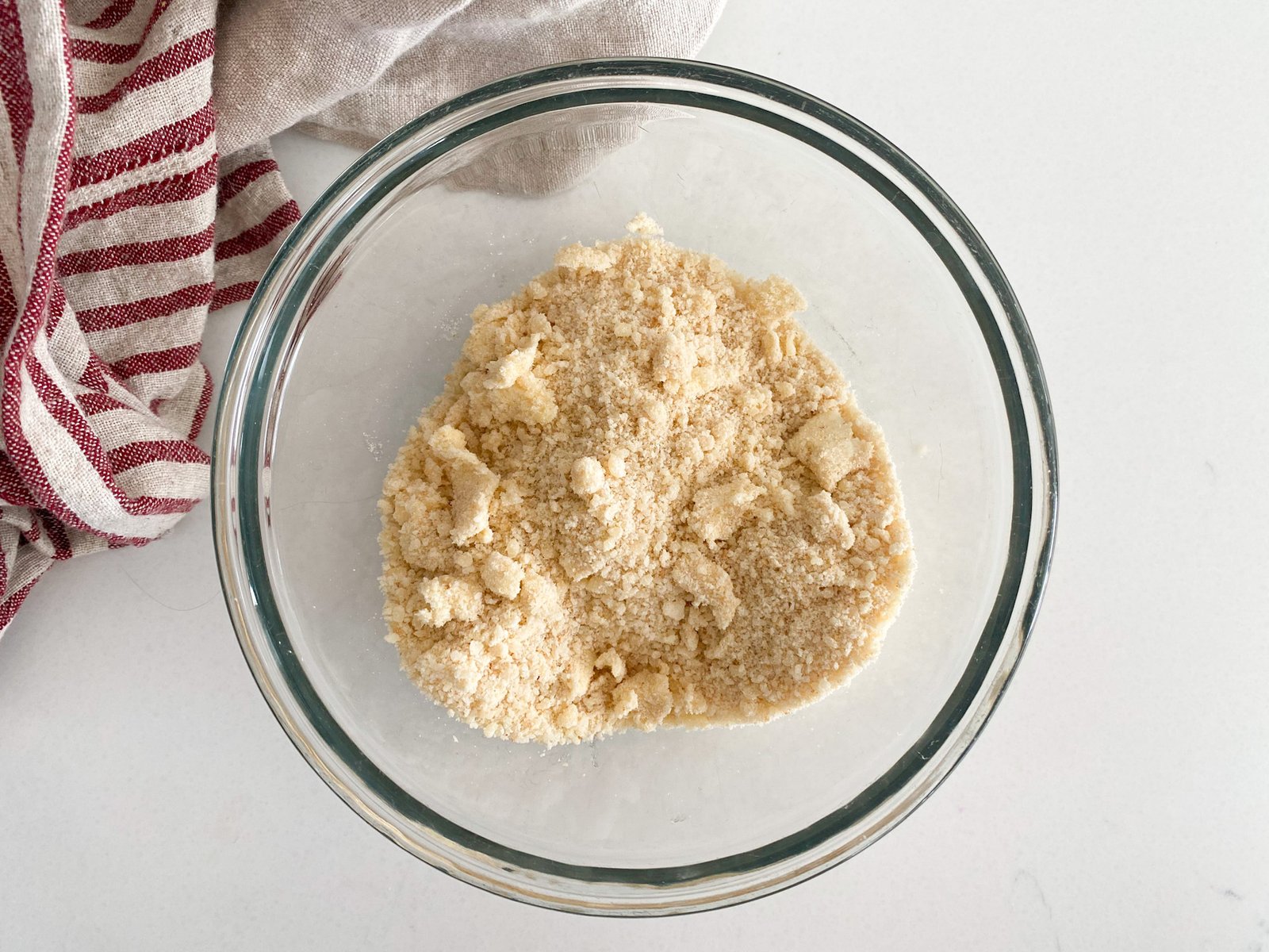 - In a bowl add grated Parmesan cheese, breadcrumbs and butter. Using your fingers press together to make a crumble. Keep grabbing and pressing it together until the butter is evenly distributed with the Parmesan cheese and breadcrumbs.½ cup Grated Parmesan Cheese, ½ cup Breadcrumbs, 1 TBSP Butter at room temperature, ¼ tsp Salt