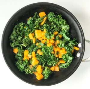 Butternut squash can be a little intimidating, but don’t shy away from it. You can buy a whole squash, peel it, take the seeds out chop it and cook it over the stove top (as I do in this recipe). Cook it all now and save the left overs for another night. You can also buy already chopped butternut squash from the grocery store. The cubes might be a little bigger than mine, but that’s ok.