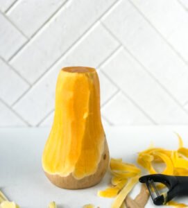 - If you have a whole butternut squash, it's easy to peel. First you will want to cut a little off the bottom and top. The flat bottom will make it easier to stand up to peel and cut. You can use a vegetable peeler, because the squash has a hard thick shell, you may have to go over it two or three time until you get all of the peel off of the flesh.
