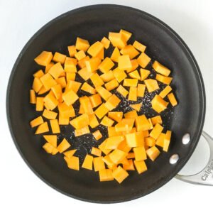 - In a pan, add in your cubed butternut squash, olive oil and salt. Cook over medium heat until it's fork tender. It should be easy to poke your fork into the squash but not be mushy. About 5 minutes, stirring occasionally so that it doesn't brown.