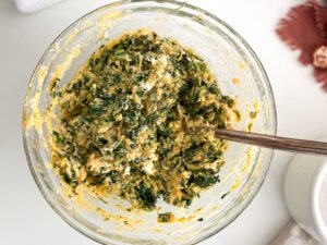 - Between two paper towels, squeeze and pat dry your defrosted spinach and set aside.