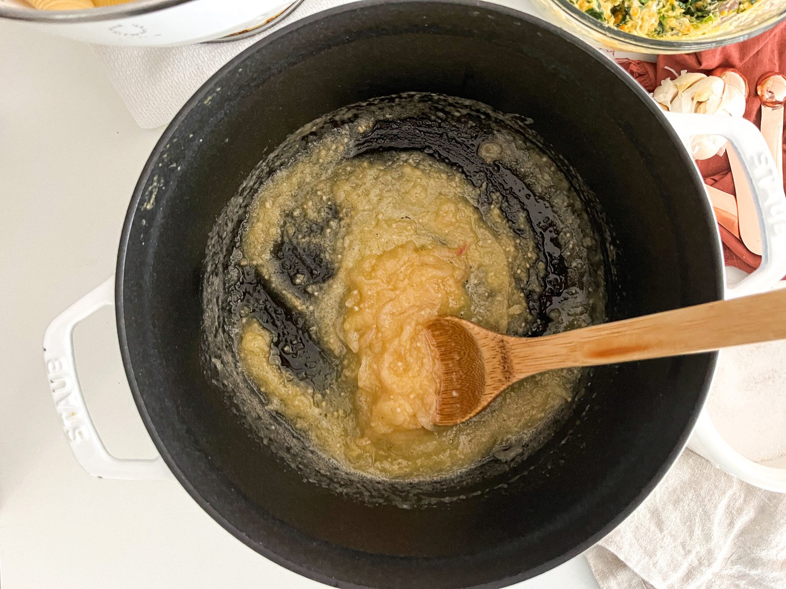 - In a large pot, over medium heat, add your shallot, a pinch (ยผ tsp) of salt, your minced garlic and butter. Let butter melt and the shallot sweat until translucent and fragrant about 1 minute.