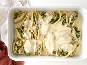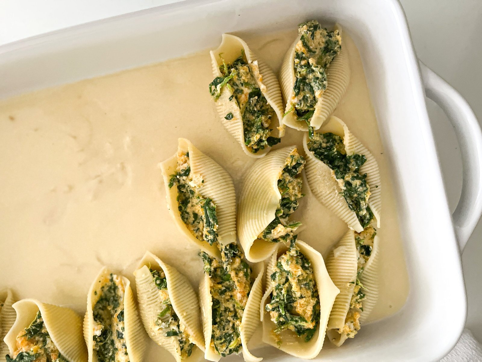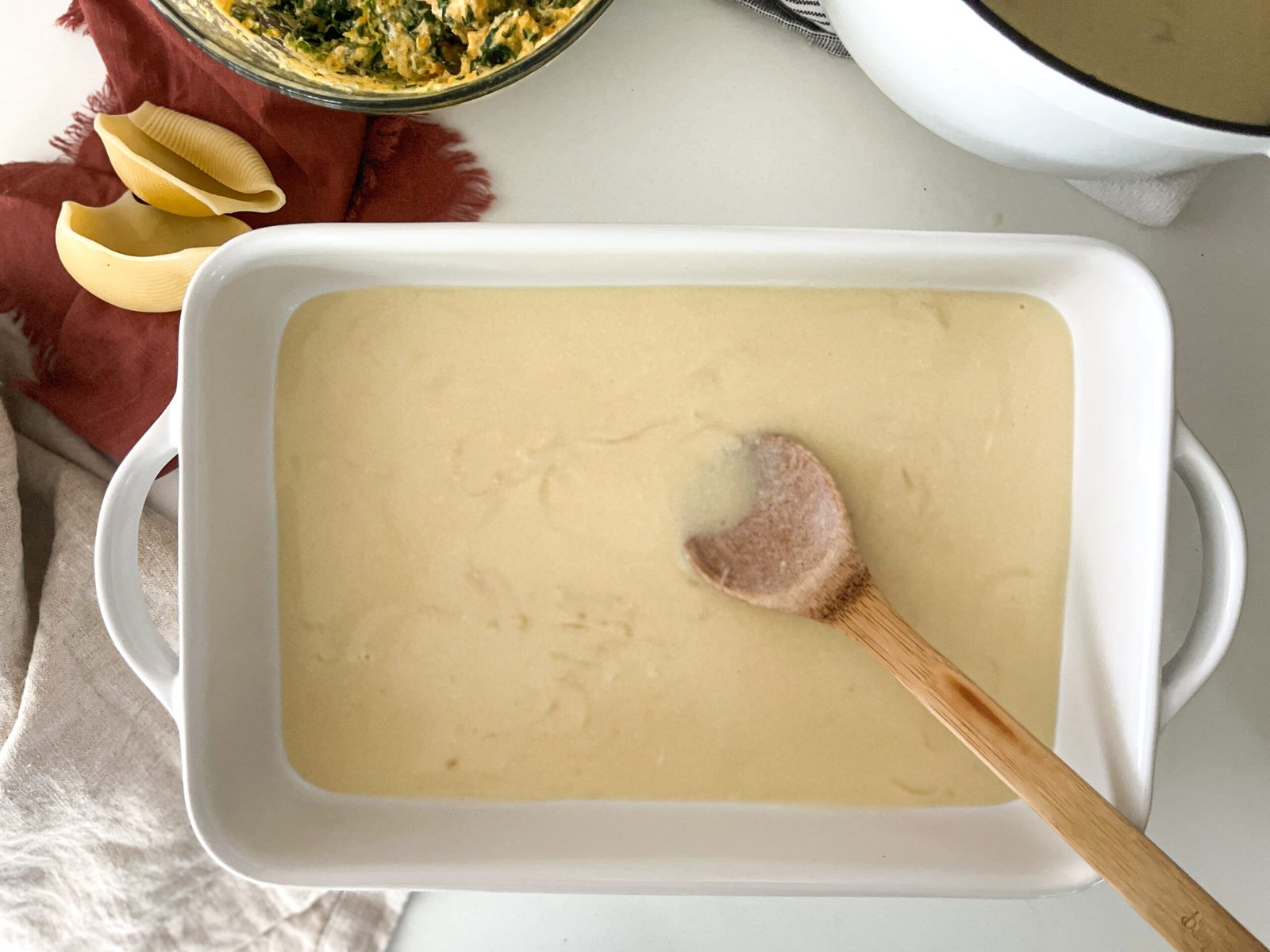 - Spoon the remaining ยฝ of the white cheese sauce on top of the stuffed shells. Spread it across as much as you can.