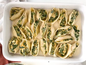 - Spoon in a heaping spoonful of filling into each shell and place them down into the casserole dish on top of the white cheese sauce.