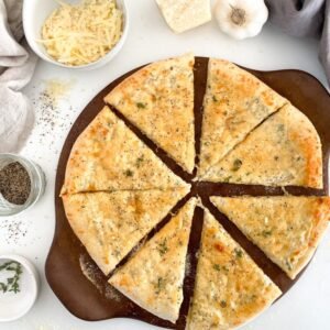 Cacio e Pepe Pizza is the white pizza of your dreams. Cacio e Pepe translates to cheese and pepper, and this pizza goes a step further with a creamy garlicky and herb béchamel cheese sauce, to give you undeniable flavor in every bite.