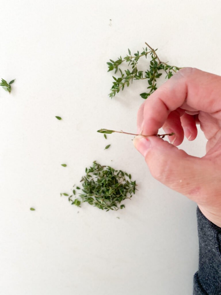 Don’t skip this step! I know it may seem quite tedious but it’s worth it. To take fresh thyme off the stem, simply use your thumb and pinter-finger nail and scrape the leaves off, they may all in a small bunch but that is okay. Once you have a pile of fresh thyme, you will want to run your knife through it once or twice to break up the small bunches and to wake up the oils.