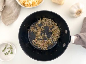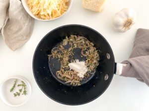 - Over medium heat, let the butter melt, the shallot soften and become translucent. Let the garlic and thyme become fragrant, about 3 minutes or so. Stir frequently to prevent the garlic from burning.