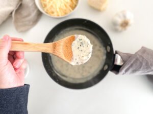This white creamy sauce has it all – garlic, shallots, fresh thyme, pepper, Italian cheese. I can’t wait for you to smell this in your kitchen!