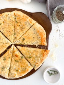 The nuttiness of fresh Parmesan cheese, the spiciness of the black pepper are the perfect duo, but when you add in Italian cheeses, minced garlic and fresh thyme plucked straight from the stem you get the most epic white cheese pizza.