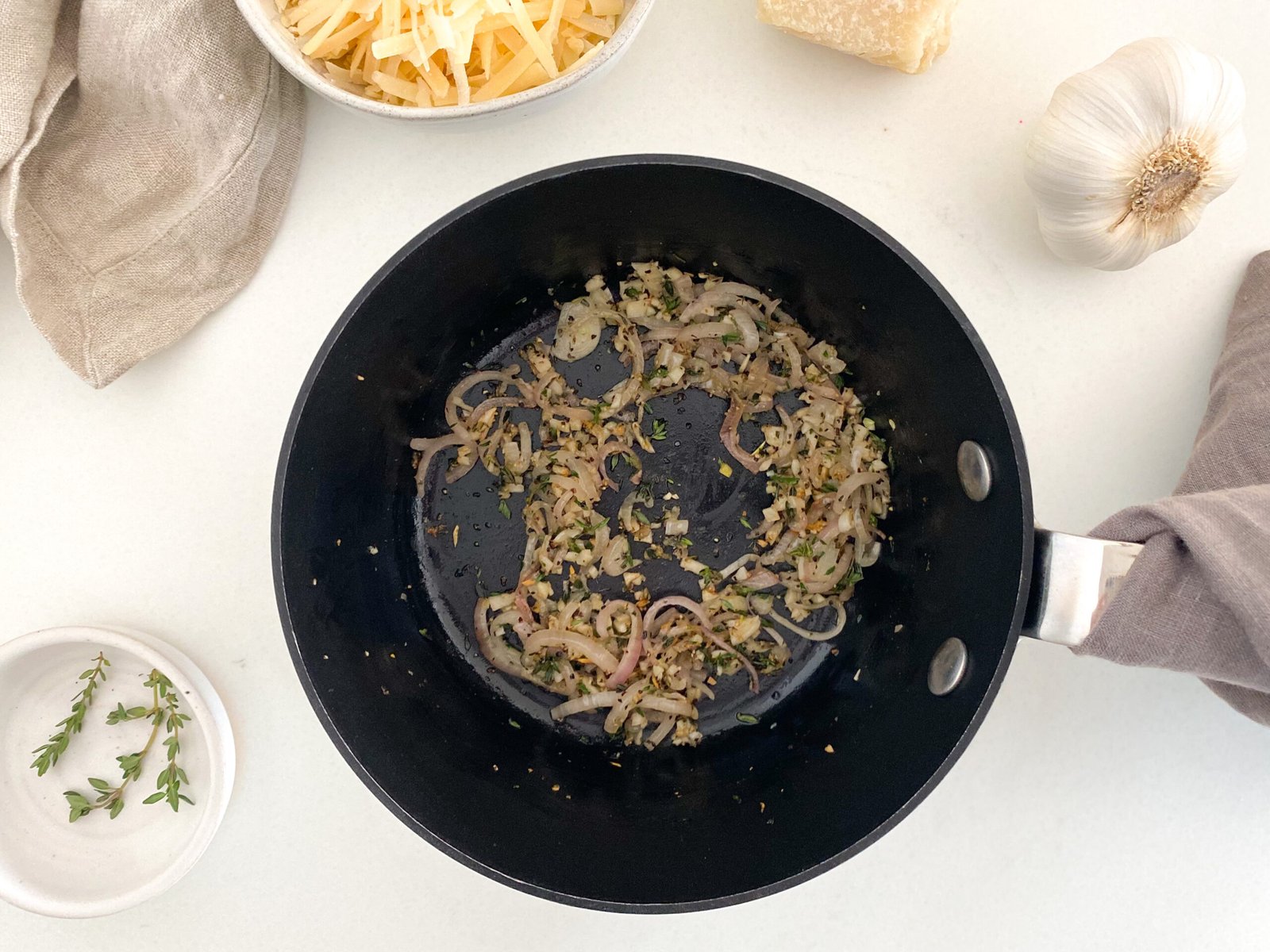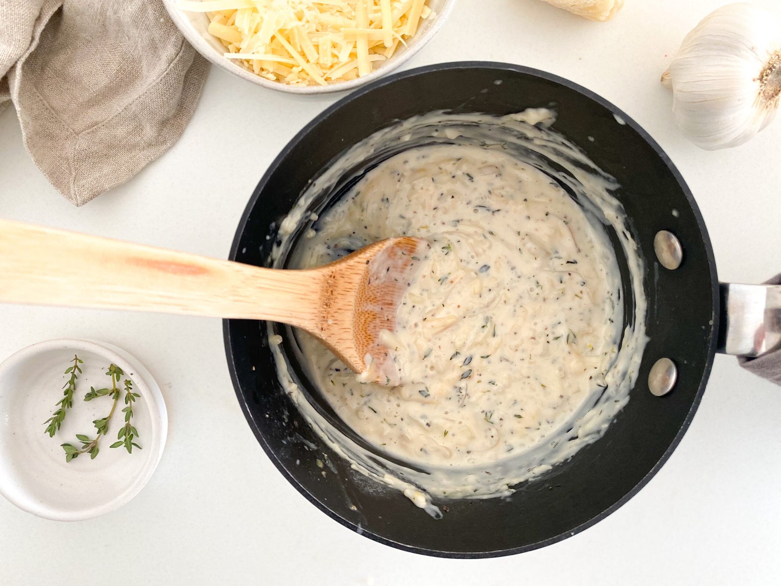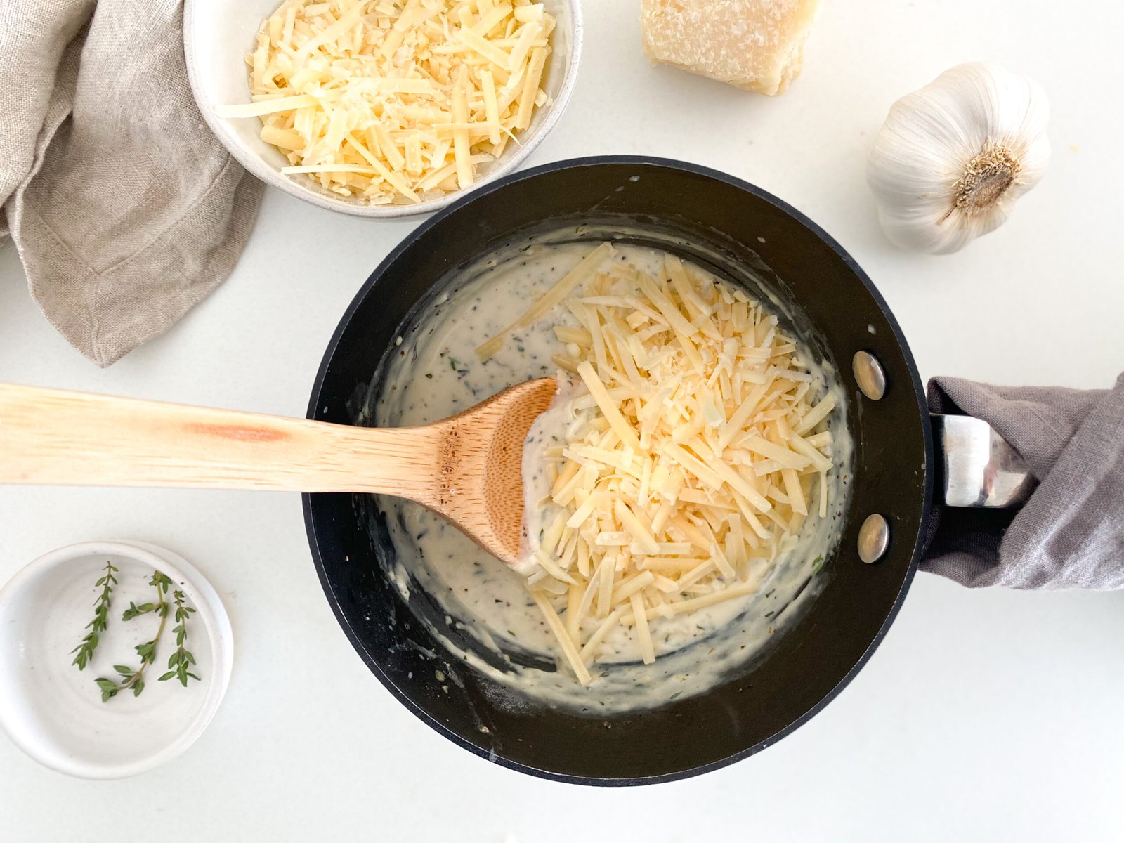 This white creamy sauce has it all – garlic, shallots, fresh thyme, pepper, Italian cheese. I can’t wait for you to smell this in your kitchen!