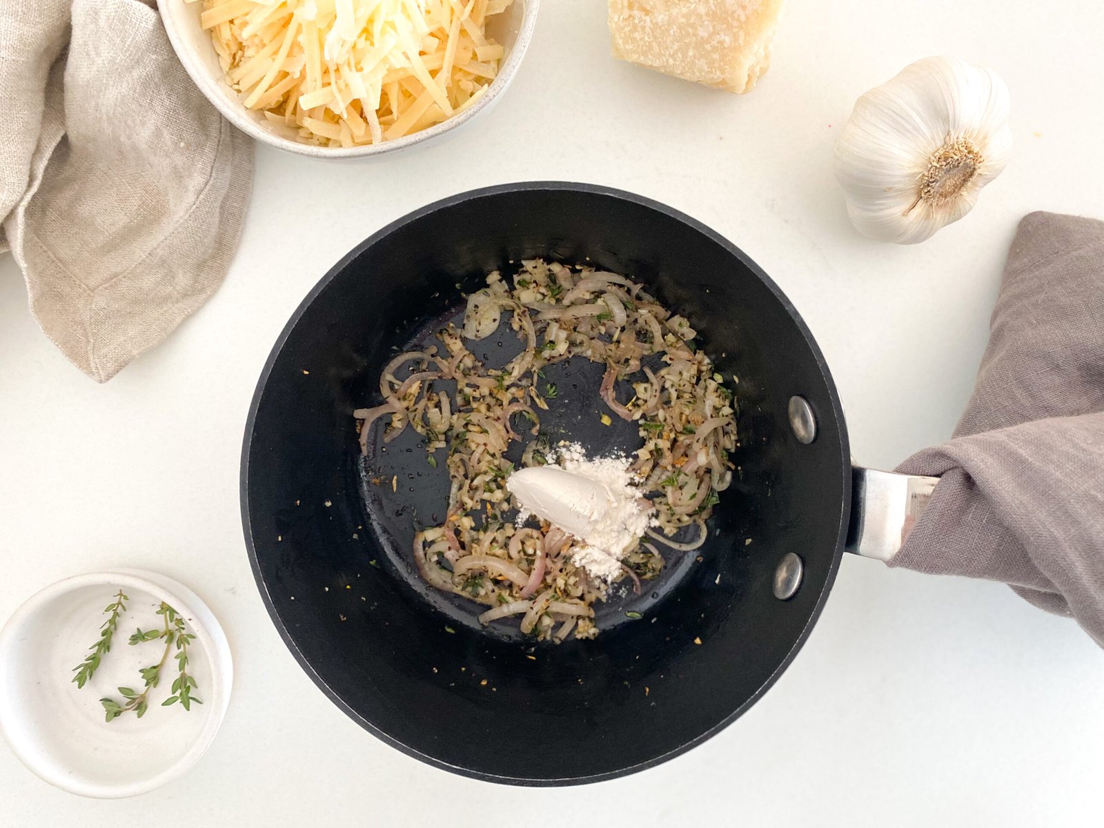 - Add in your flour, stir it around your pot and let it cook while you measure out your milk.