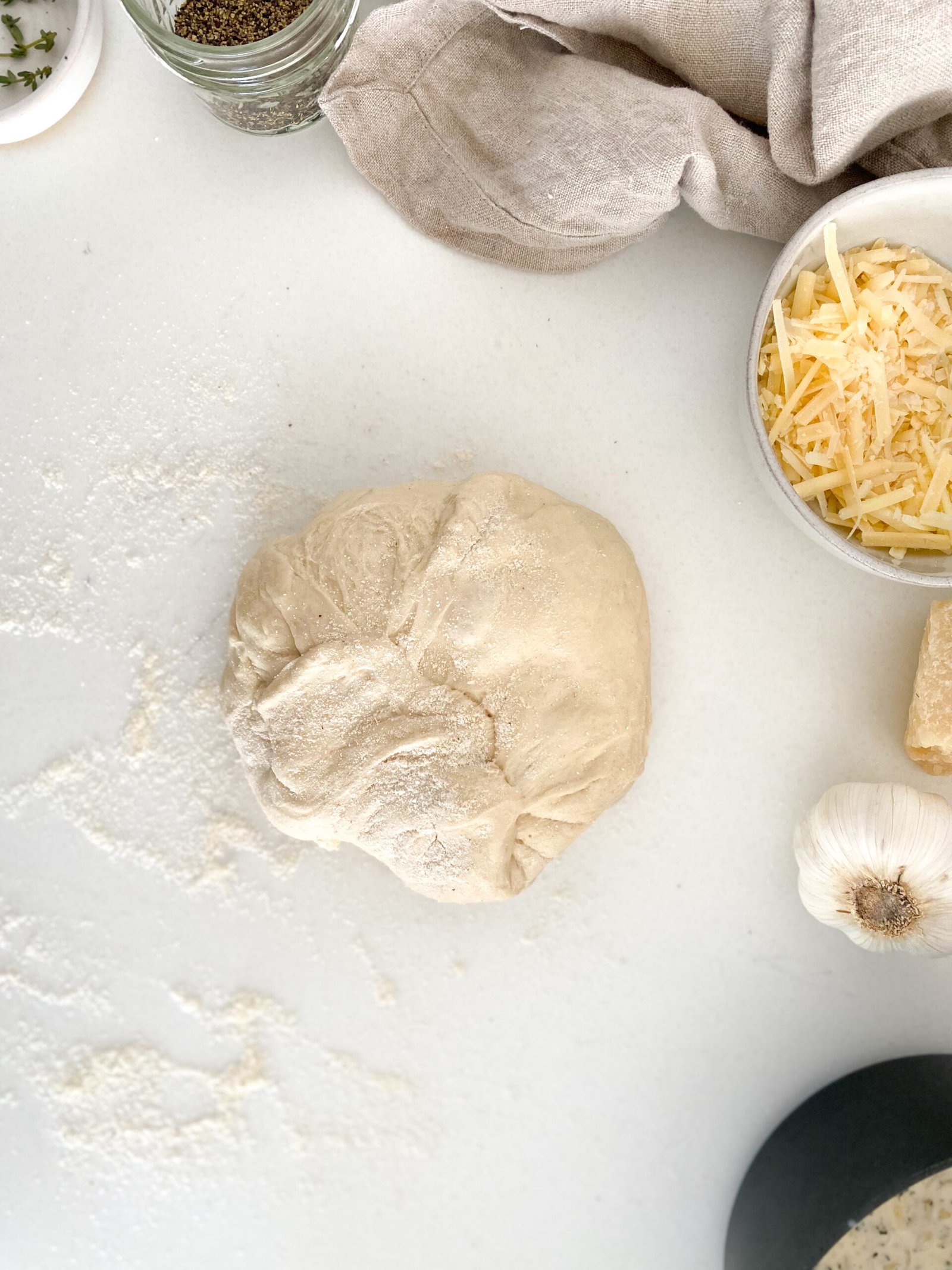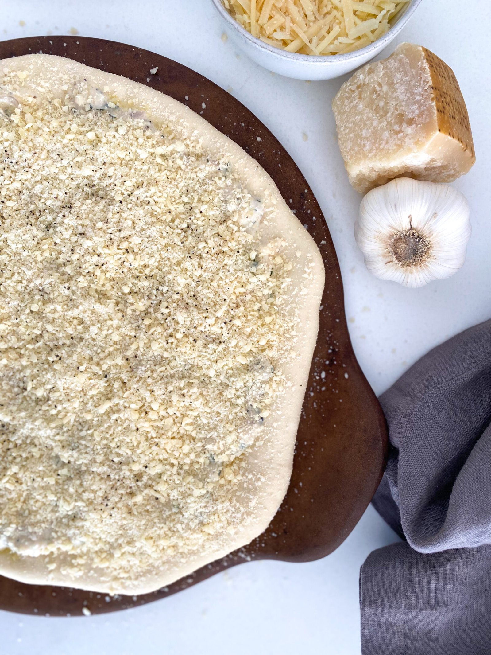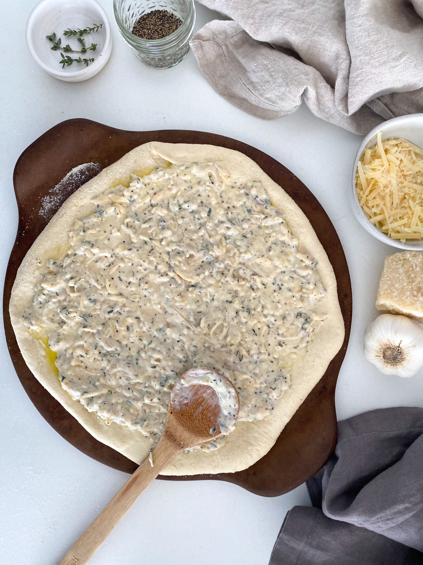 The nuttiness of fresh Parmesan cheese, the spiciness of the black pepper are the perfect duo, but when you add in Italian cheeses, minced garlic and fresh thyme plucked straight from the stem you get the most epic white cheese pizza.