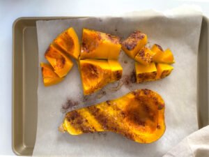 - Cut your butternut squash, scoop out the seeds. Place on your baking sheet, facing upward. Drizzle with olive oil, sprinkle with cinnamon and ¼ tsp of salt. Roast until it's fork tender, about 32 minutes. Set it aside to cool while you prep the other ingredients.