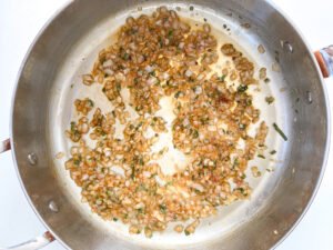 You can do this in two batches, complete the recipe below steps 1 – 8 until you’ve been stirring for 13 minutes (set a timer as soon as you start step 6. After stirring for 13 minutes, you can stop the process. To stop, spread out the risotto on a parchment paper lined sheet pan so that it is in one even layer. Store in the refrigerator, uncovered until completely cool. If you’re doing this earlier in the week from when you want to serve it, once it’s completely cooled you can cover it or transfer to a food storage container and keep in the refrigerator until you want to reheat and finish cooking.