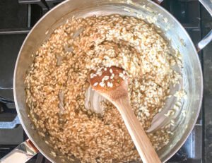 - As your stock leaves the pan you will want to add another ½ ladle of your hot stock as you continue to stir. Let the stock almost dry up before adding your next ladle. Stir. Stir. Stir.
