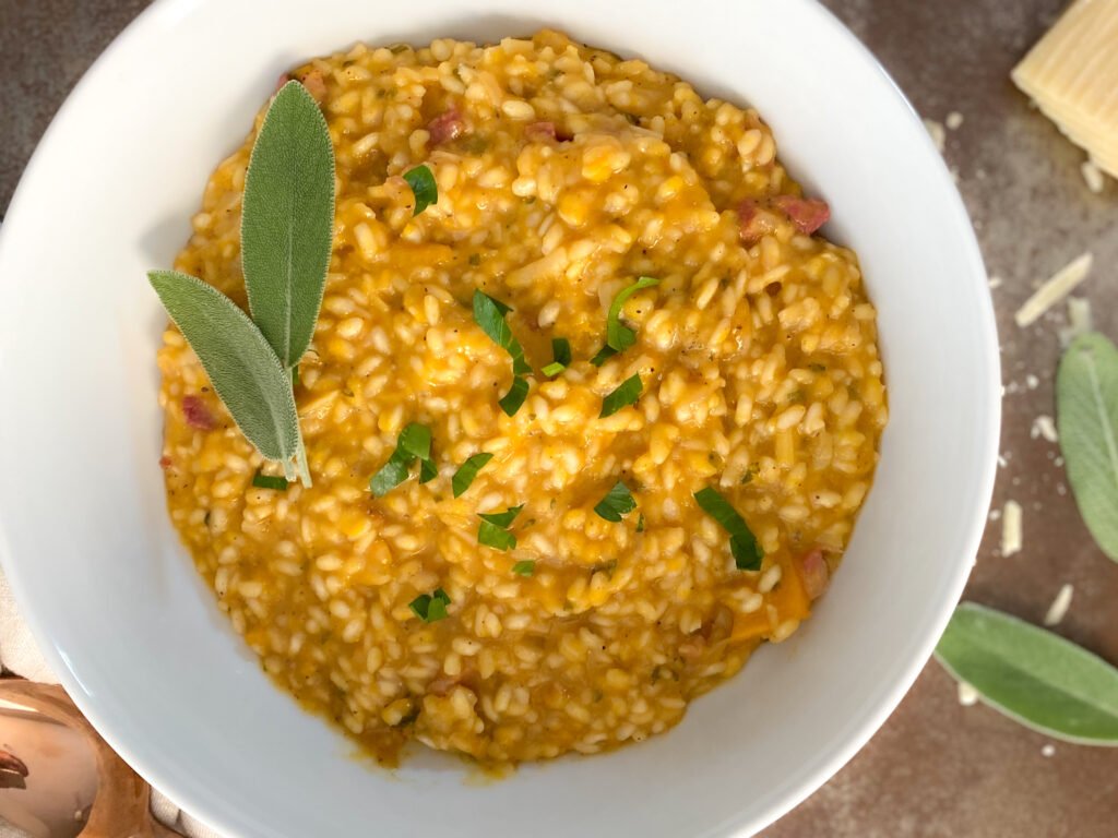 Risotto is so deliciously creamy and probably one of those “order at a restaurant” only dishes until today! It’s quite simple in steps, but labor intensive in stirring, with this recipe I will show you an easy way to break up the steps so you can make it ahead for the holidays or for an easy weeknight dinner.